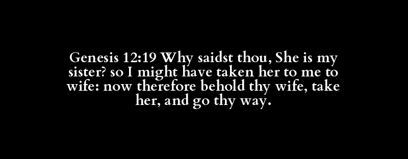 Genesis 12:19 Why saidst thou, She is my sister? so I might have taken her to me to wife: now therefore behold thy wife, take her, and go thy way.