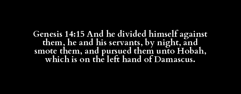 Genesis 14:15 And he divided himself against them, he and his servants, by night, and smote them, and pursued them unto Hobah, which is on the left hand of Damascus.