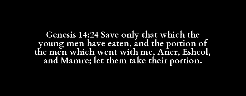 Genesis 14:24 Save only that which the young men have eaten, and the portion of the men which went with me, Aner, Eshcol, and Mamre; let them take their portion.