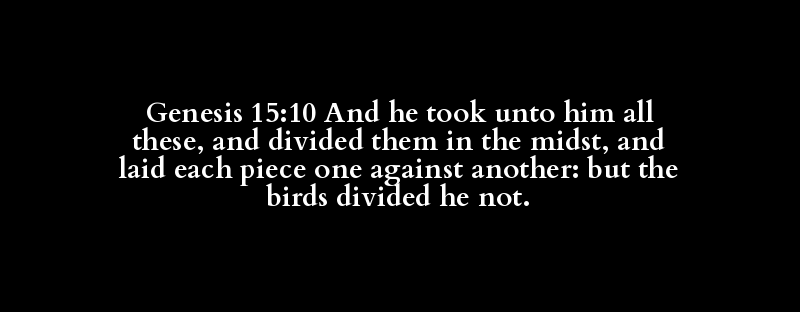 Genesis 15:10 And he took unto him all these, and divided them in the midst, and laid each piece one against another: but the birds divided he not.