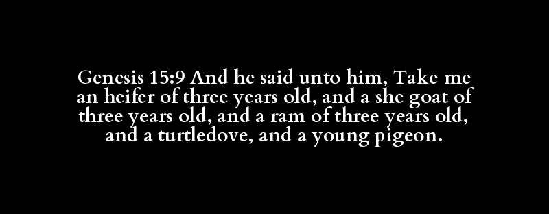 Genesis 15:9 And he said unto him, Take me an heifer of three years old, and a she goat of three years old, and a ram of three years old, and a turtledove, and a young pigeon.
