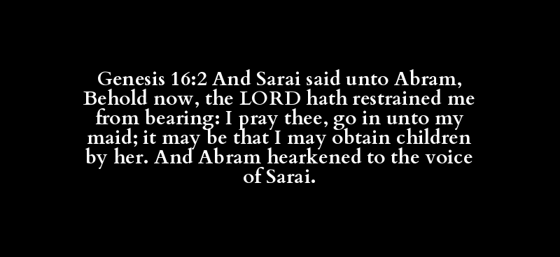 Genesis 16:2 And Sarai said unto Abram, Behold now, the LORD hath restrained me from bearing: I pray thee, go in unto my maid; it may be that I may obtain children by her. And Abram hearkened to the voice of Sarai.