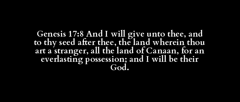 Genesis 17:8 And I will give unto thee, and to thy seed after thee, the land wherein thou art a stranger, all the land of Canaan, for an everlasting possession; and I will be their God.