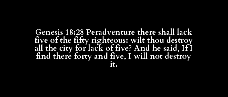 Genesis 18:28 Peradventure there shall lack five of the fifty righteous: wilt thou destroy all the city for lack of five? And he said, If I find there forty and five, I will not destroy it.