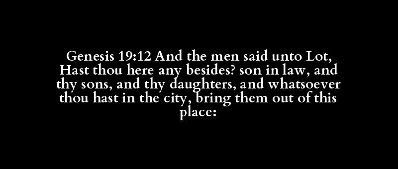 Genesis 19:12 And the men said unto Lot, Hast thou here any besides? son in law, and thy sons, and thy daughters, and whatsoever thou hast in the city, bring them out of this place: