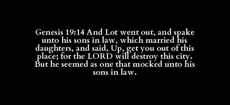 Genesis 19:14 And Lot went out, and spake unto his sons in law, which married his daughters, and said, Up, get you out of this place; for the LORD will destroy this city. But he seemed as one that mocked unto his sons in law.