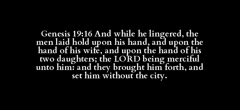 Genesis 19:16 And while he lingered, the men laid hold upon his hand, and upon the hand of his wife, and upon the hand of his two daughters; the LORD being merciful unto him: and they brought him forth, and set him without the city.