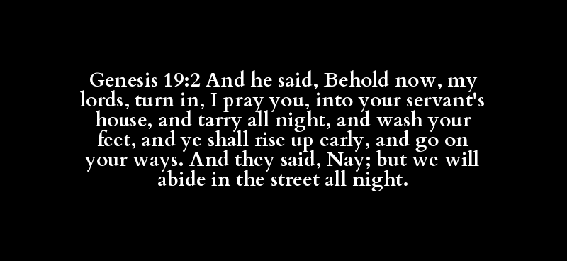 Genesis 19:2 And he said, Behold now, my lords, turn in, I pray you, into your servant's house, and tarry all night, and wash your feet, and ye shall rise up early, and go on your ways. And they said, Nay; but we will abide in the street all night.