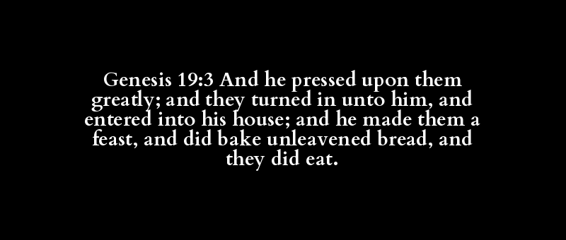 Genesis 19:3 And he pressed upon them greatly; and they turned in unto him, and entered into his house; and he made them a feast, and did bake unleavened bread, and they did eat.