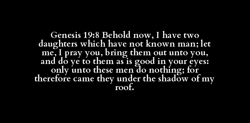 Genesis 19:8 Behold now, I have two daughters which have not known man; let me, I pray you, bring them out unto you, and do ye to them as is good in your eyes: only unto these men do nothing; for therefore came they under the shadow of my roof.