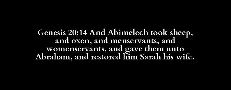 Genesis 20:14 And Abimelech took sheep, and oxen, and menservants, and womenservants, and gave them unto Abraham, and restored him Sarah his wife.