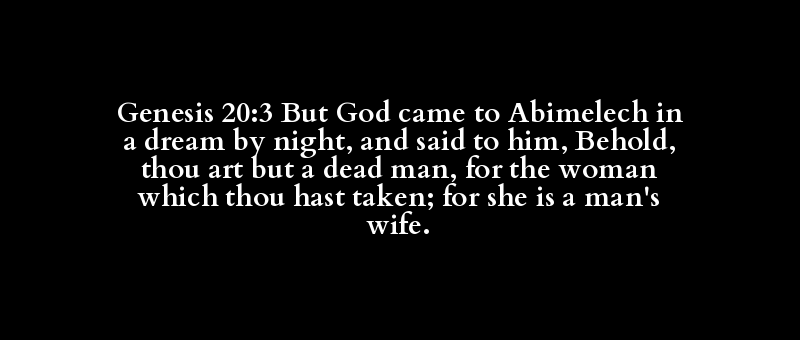Genesis 20:3 But God came to Abimelech in a dream by night, and said to him, Behold, thou art but a dead man, for the woman which thou hast taken; for she is a man's wife.