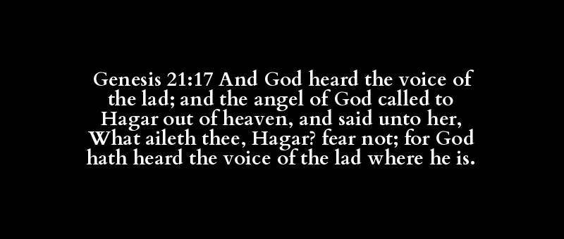 Genesis 21:17 And God heard the voice of the lad; and the angel of God called to Hagar out of heaven, and said unto her, What aileth thee, Hagar? fear not; for God hath heard the voice of the lad where he is.