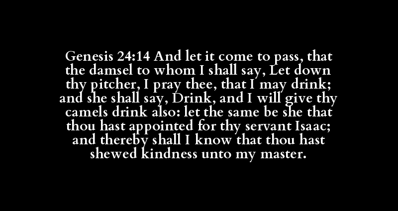 Genesis 24:14 And let it come to pass, that the damsel to whom I shall say, Let down thy pitcher, I pray thee, that I may drink; and she shall say, Drink, and I will give thy camels drink also: let the same be she that thou hast appointed for thy servant Isaac; and thereby shall I know that thou hast shewed kindness unto my master.