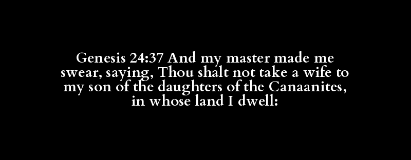 Genesis 24:37 And my master made me swear, saying, Thou shalt not take a wife to my son of the daughters of the Canaanites, in whose land I dwell: