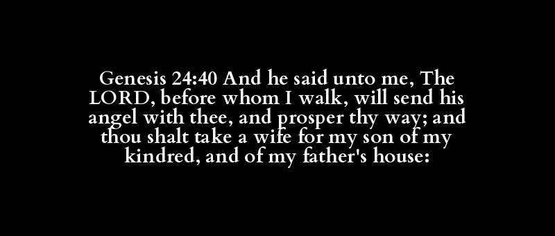 Genesis 24:40 And he said unto me, The LORD, before whom I walk, will send his angel with thee, and prosper thy way; and thou shalt take a wife for my son of my kindred, and of my father's house: