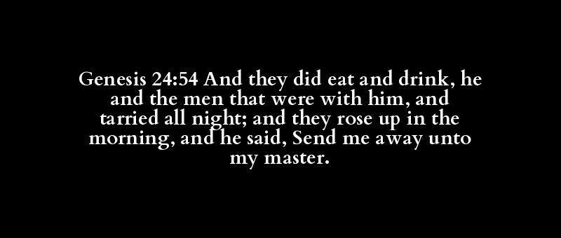 Genesis 24:54 And they did eat and drink, he and the men that were with him, and tarried all night; and they rose up in the morning, and he said, Send me away unto my master.