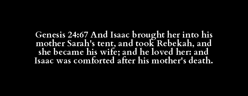 Genesis 24:67 And Isaac brought her into his mother Sarah's tent, and took Rebekah, and she became his wife; and he loved her: and Isaac was comforted after his mother's death.