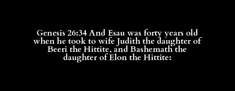 Genesis 26:34 And Esau was forty years old when he took to wife Judith the daughter of Beeri the Hittite, and Bashemath the daughter of Elon the Hittite: