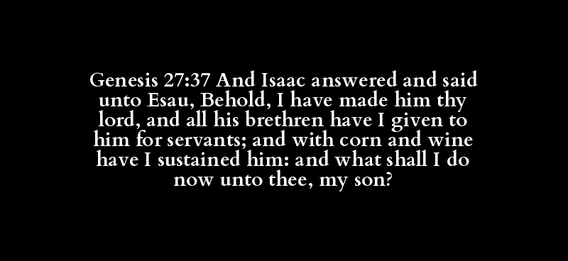 Genesis 27:37 And Isaac answered and said unto Esau, Behold, I have made him thy lord, and all his brethren have I given to him for servants; and with corn and wine have I sustained him: and what shall I do now unto thee, my son?