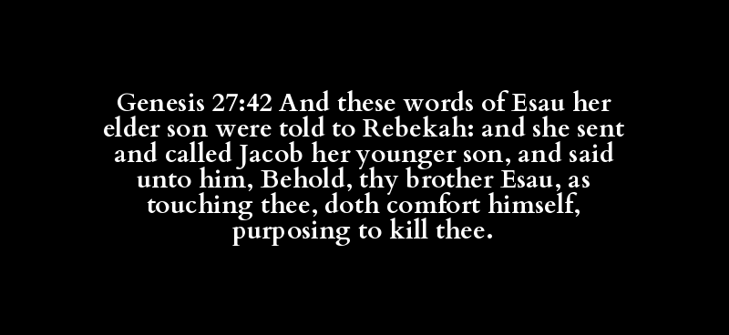 Genesis 27:42 And these words of Esau her elder son were told to Rebekah: and she sent and called Jacob her younger son, and said unto him, Behold, thy brother Esau, as touching thee, doth comfort himself, purposing to kill thee.