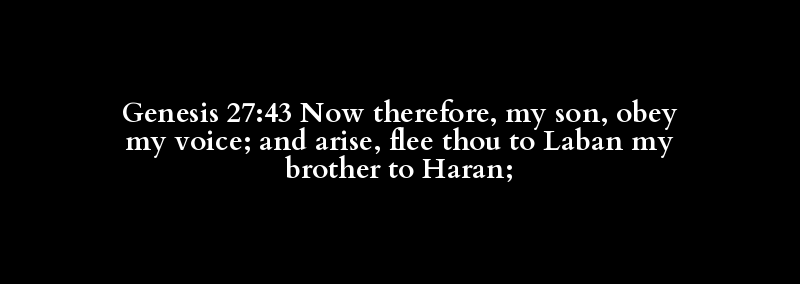 Genesis 27:43 Now therefore, my son, obey my voice; and arise, flee thou to Laban my brother to Haran;