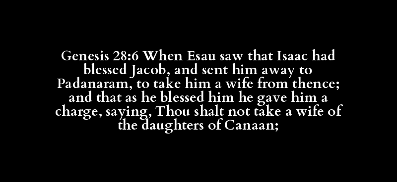 Genesis 28:6 When Esau saw that Isaac had blessed Jacob, and sent him away to Padanaram, to take him a wife from thence; and that as he blessed him he gave him a charge, saying, Thou shalt not take a wife of the daughters of Canaan;