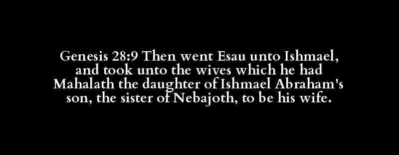 Genesis 28:9 Then went Esau unto Ishmael, and took unto the wives which he had Mahalath the daughter of Ishmael Abraham's son, the sister of Nebajoth, to be his wife.