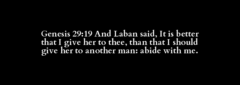 Genesis 29:19 And Laban said, It is better that I give her to thee, than that I should give her to another man: abide with me.