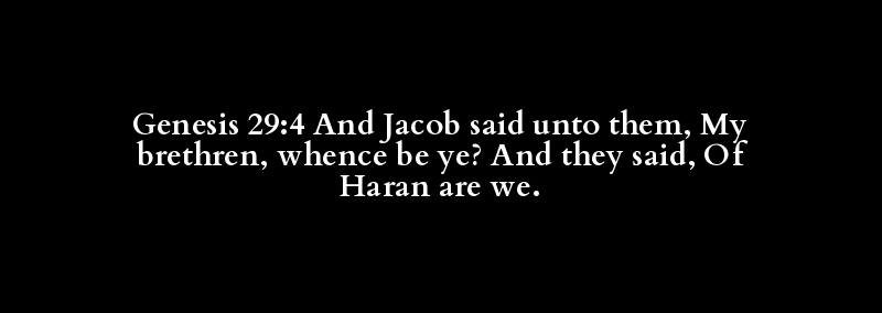Genesis 29:4 And Jacob said unto them, My brethren, whence be ye? And they said, Of Haran are we.