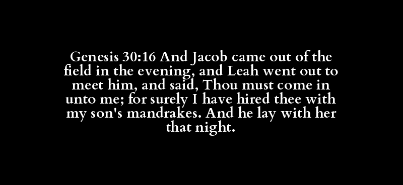 Genesis 30:16 And Jacob came out of the field in the evening, and Leah went out to meet him, and said, Thou must come in unto me; for surely I have hired thee with my son's mandrakes. And he lay with her that night.