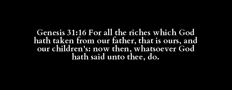 Genesis 31:16 For all the riches which God hath taken from our father, that is ours, and our children's: now then, whatsoever God hath said unto thee, do.