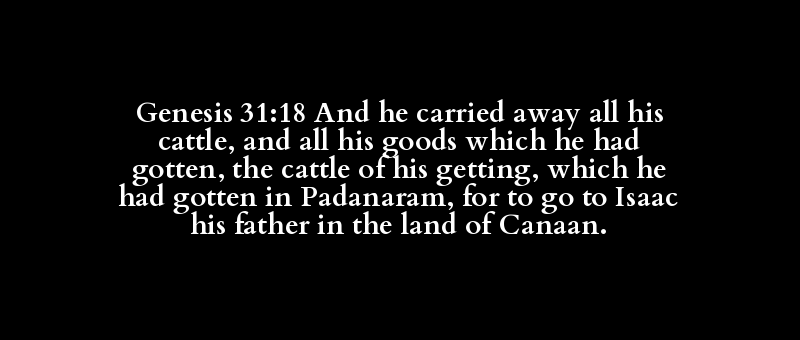 Genesis 31:18 And he carried away all his cattle, and all his goods which he had gotten, the cattle of his getting, which he had gotten in Padanaram, for to go to Isaac his father in the land of Canaan.