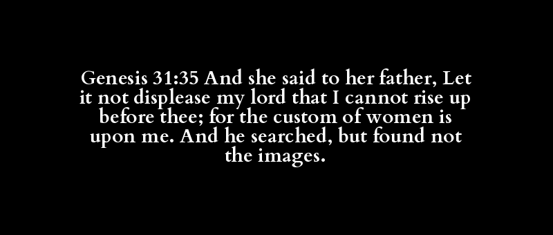 Genesis 31:35 And she said to her father, Let it not displease my lord that I cannot rise up before thee; for the custom of women is upon me. And he searched, but found not the images.