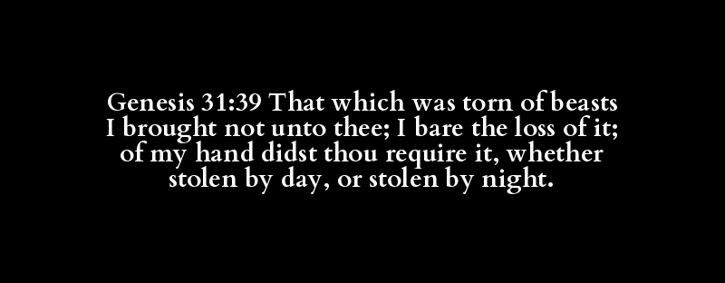 Genesis 31:39 That which was torn of beasts I brought not unto thee; I bare the loss of it; of my hand didst thou require it, whether stolen by day, or stolen by night.