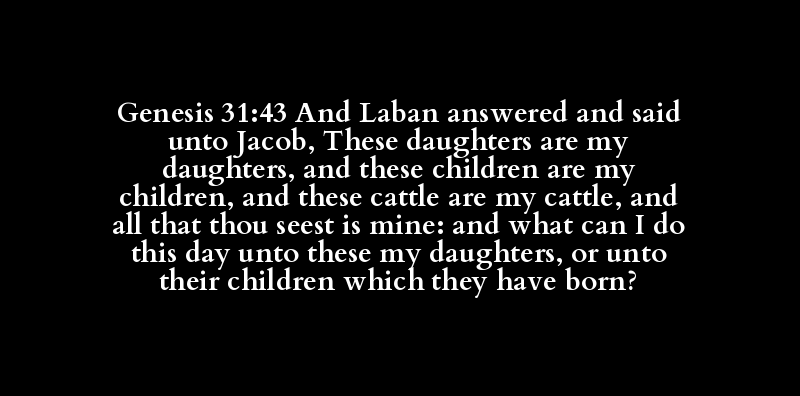 Genesis 31:43 And Laban answered and said unto Jacob, These daughters are my daughters, and these children are my children, and these cattle are my cattle, and all that thou seest is mine: and what can I do this day unto these my daughters, or unto their children which they have born?