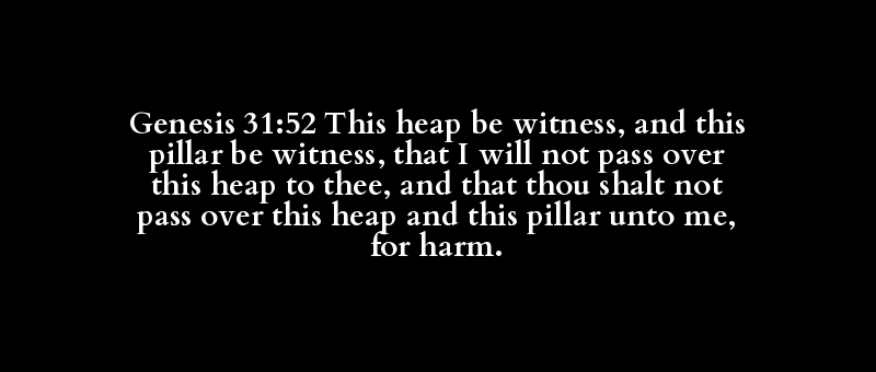 Genesis 31:52 This heap be witness, and this pillar be witness, that I will not pass over this heap to thee, and that thou shalt not pass over this heap and this pillar unto me, for harm.