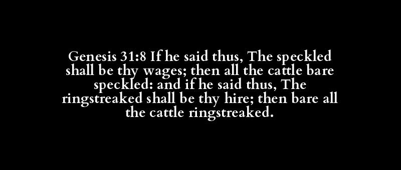 Genesis 31:8 If he said thus, The speckled shall be thy wages; then all the cattle bare speckled: and if he said thus, The ringstreaked shall be thy hire; then bare all the cattle ringstreaked.