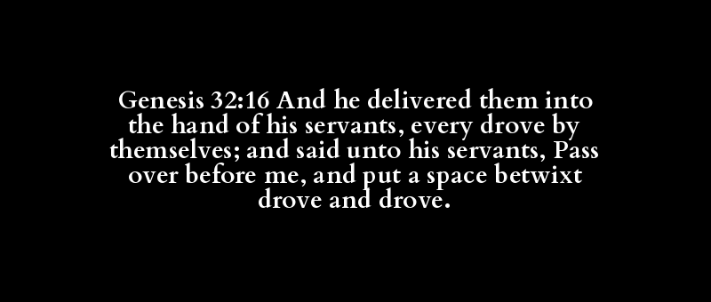 Genesis 32:16 And he delivered them into the hand of his servants, every drove by themselves; and said unto his servants, Pass over before me, and put a space betwixt drove and drove.