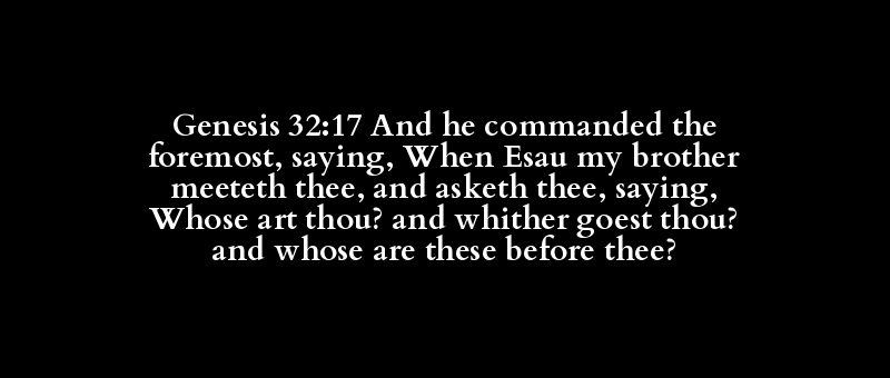 Genesis 32:17 And he commanded the foremost, saying, When Esau my brother meeteth thee, and asketh thee, saying, Whose art thou? and whither goest thou? and whose are these before thee?