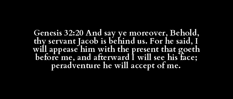 Genesis 32:20 And say ye moreover, Behold, thy servant Jacob is behind us. For he said, I will appease him with the present that goeth before me, and afterward I will see his face; peradventure he will accept of me.