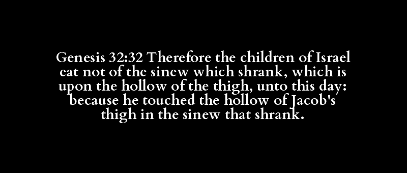 Genesis 32:32 Therefore the children of Israel eat not of the sinew which shrank, which is upon the hollow of the thigh, unto this day: because he touched the hollow of Jacob's thigh in the sinew that shrank.