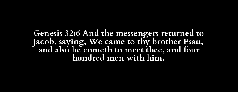 Genesis 32:6 And the messengers returned to Jacob, saying, We came to thy brother Esau, and also he cometh to meet thee, and four hundred men with him.