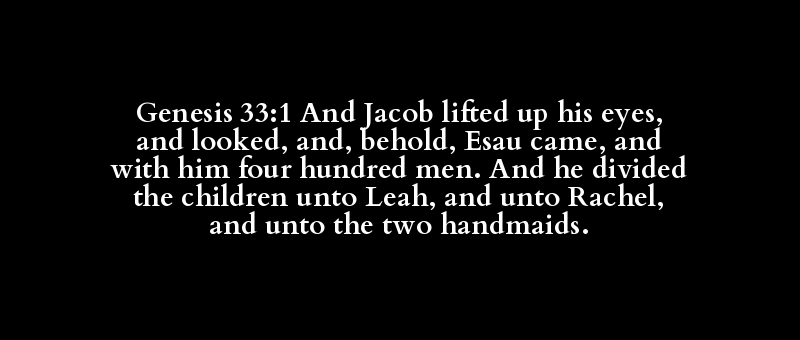 Genesis 33:1 And Jacob lifted up his eyes, and looked, and, behold, Esau came, and with him four hundred men. And he divided the children unto Leah, and unto Rachel, and unto the two handmaids.