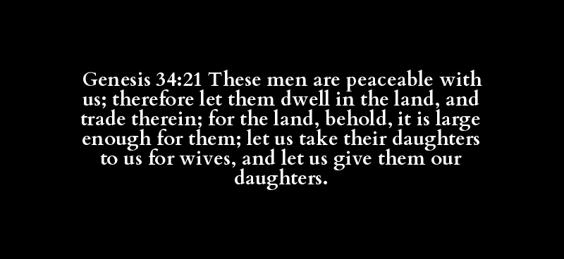 Genesis 34:21 These men are peaceable with us; therefore let them dwell in the land, and trade therein; for the land, behold, it is large enough for them; let us take their daughters to us for wives, and let us give them our daughters.
