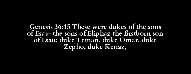 Genesis 36:15 These were dukes of the sons of Esau: the sons of Eliphaz the firstborn son of Esau; duke Teman, duke Omar, duke Zepho, duke Kenaz,
