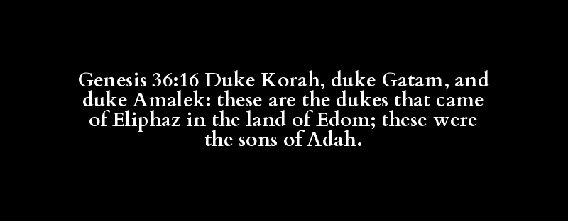 Genesis 36:16 Duke Korah, duke Gatam, and duke Amalek: these are the dukes that came of Eliphaz in the land of Edom; these were the sons of Adah.