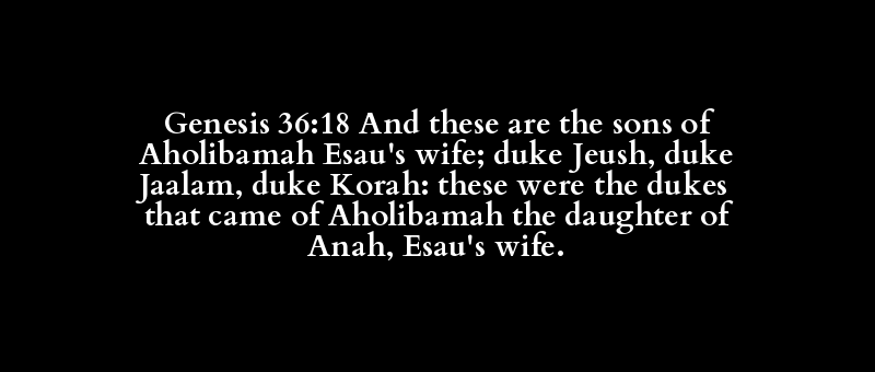 Genesis 36:18 And these are the sons of Aholibamah Esau's wife; duke Jeush, duke Jaalam, duke Korah: these were the dukes that came of Aholibamah the daughter of Anah, Esau's wife.