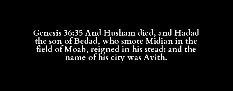 Genesis 36:35 And Husham died, and Hadad the son of Bedad, who smote Midian in the field of Moab, reigned in his stead: and the name of his city was Avith.