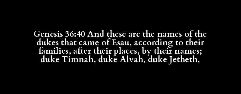 | + base, (in-)fame(-ous), named(-d), re.. | captain, duke, (chief) friend, governo.. | Esau | family, kind(-red) | country, × home, × open, place, room, .. | + base, (in-)fame(-ous), named(-d), re.. | captain, duke, (chief) friend, governo.. | Timna, Timnah | captain, duke, (chief) friend, governo.. | Aliah, Alvah | captain, duke, (chief) friend, governo.. | Jetheth |